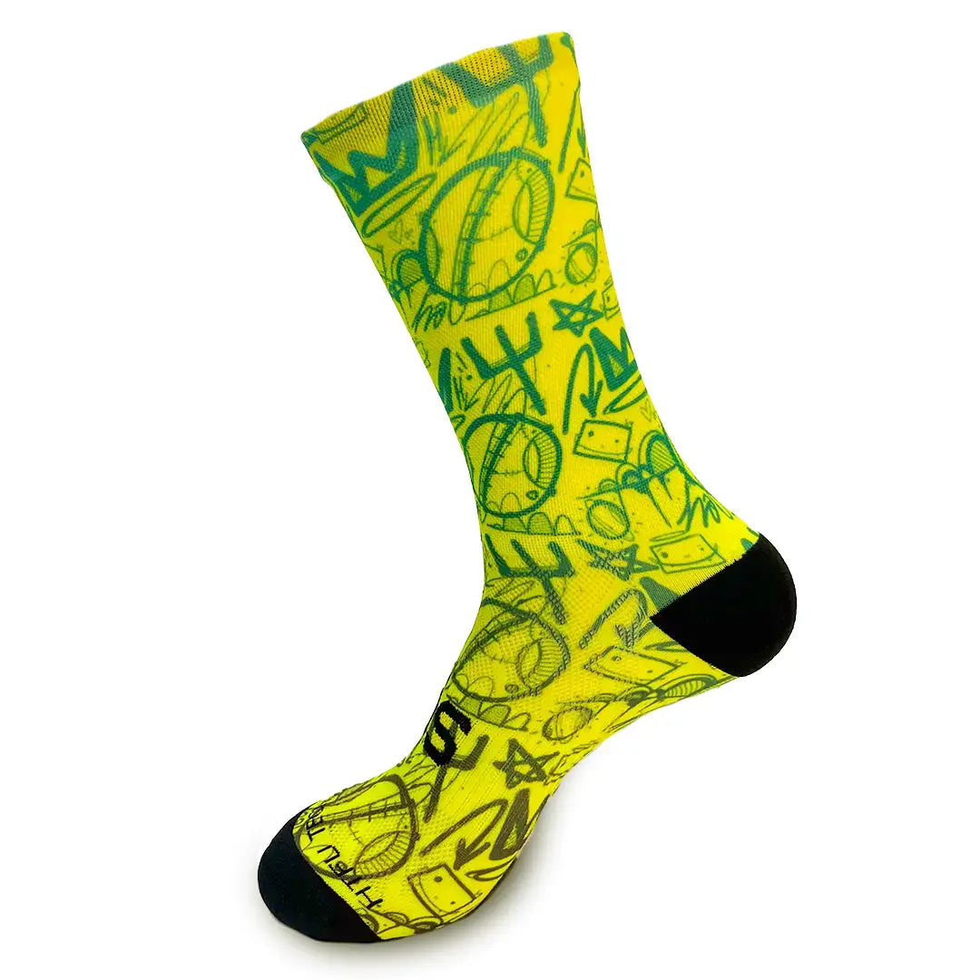 Estos son nuestros calcetines vibrantes para crear grupos divertidos. Con una mezcla creativa de grafitis, estos calcetines son una verdadera explosión de color, perfectos para lucir diversión a la hora de practicar tu deporte favorito. Con un patrón loco y excéntrico.
